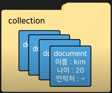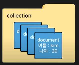 - collection이라는 폴더 하나를 만들고 그 안에다가 document라고 부르는 하나의 파일들을 만들어서 데이터를 저장합니다. 파일 안에는 json 형태로 데이터를 저장할 수 있습니다.