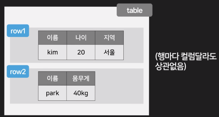 - 똑같이 table을 하나 만들고 row를 생성한 뒤에 거기에다가 자유롭게 컬럼을 만들어서 데이터를 기입하는 식으로 자료를 저장합니다.