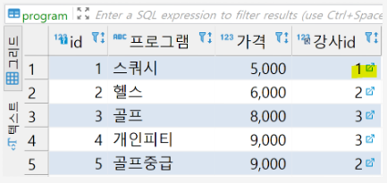 - program 테이블에 가면 foreign key 컬럼에 화살표가 생기는데 눌러보면 연결된 다른 테이블과 행을 보여줍니다. (나중에 강사id가 1인 사람이 누군지 궁금하면 클릭만 해보면 됩니다.)