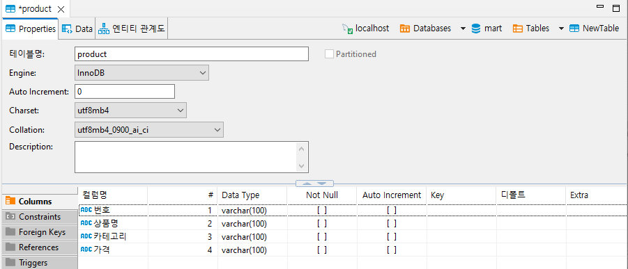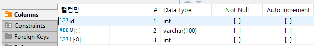 - Columns에서 NOT NULL, DEFAULT 값, Auto Increment 지정가능