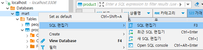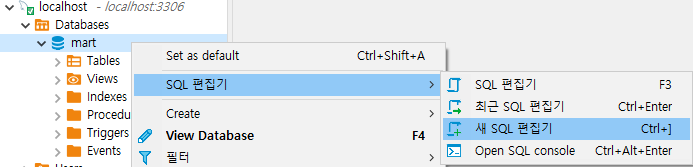 - 데이터베이스명 우클릭 - SQL 편집기 - SQL 편집기 클릭