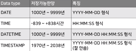 - 주로 DATETIME을 사용합니다. (TIMESTAMP는 2038년까지만 저장이 가능하기 때문)