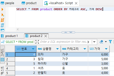 SELECT * FROM product ORDER BY 가격 ASC, 카테고리 ASC