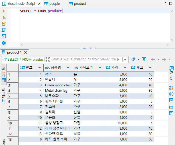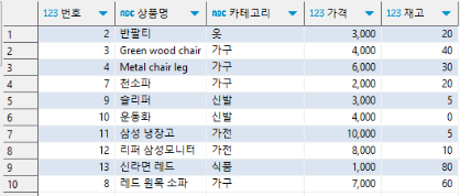 - product 테이블에서 카테고리가 가구인 행만 출력