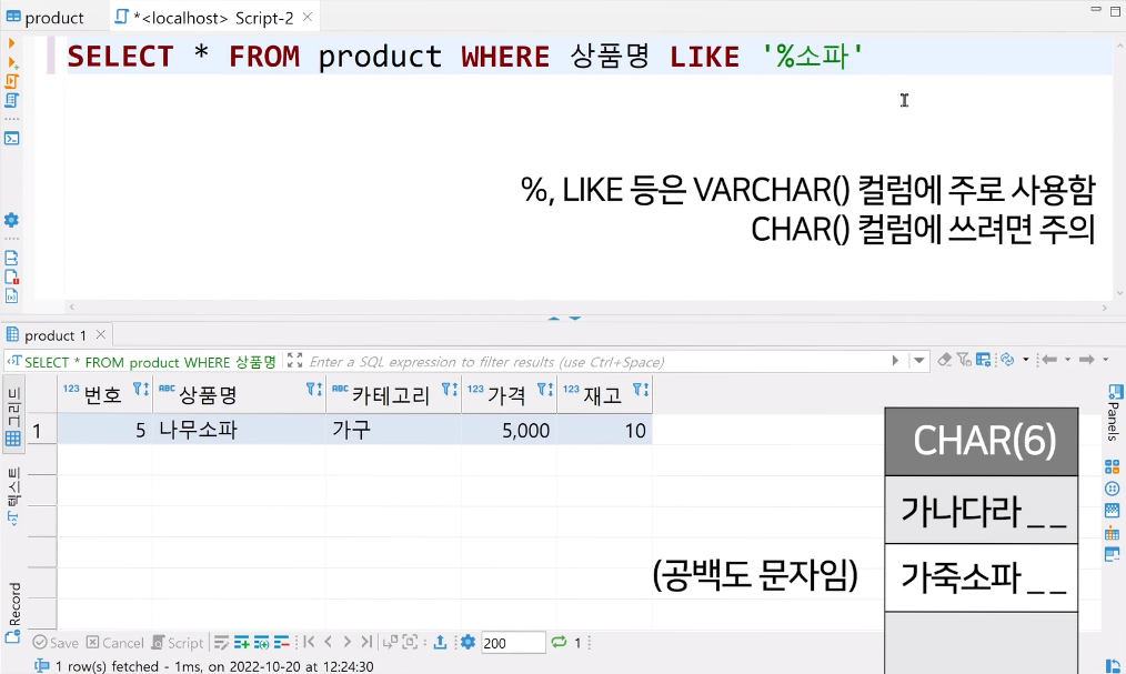 - CHAR() 컬럼에 사용할 때는 주의가 필요합니다. CHAR()의 경우 무조건 공백으로 나머지 자리를 채우게 됩니다. 따라서 아래와 같이 가죽소파라고 저장된 데이터가 있다고 하면은 가죽소파_ _ 로 저장되기 때문에 단순히 "%소파"로 검색하면 검색결과가 나오지 않게 됩니다.