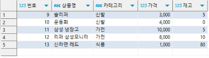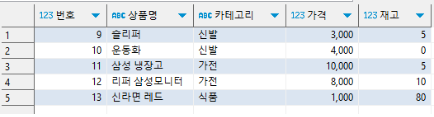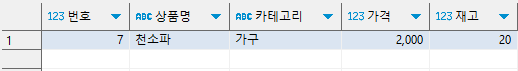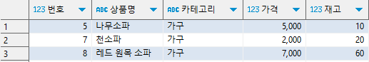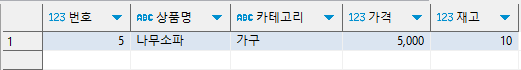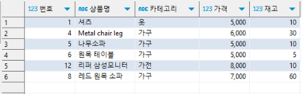 - 가격이 5000이면서 카테고리가 "가구"인 행 출력하기