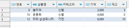 SELECT * FROM 테이블명 WHERE 컬럼명 IN (값, 값, 값) - 카테고리가 신발, 가전, 식품인 데이터 출력하기