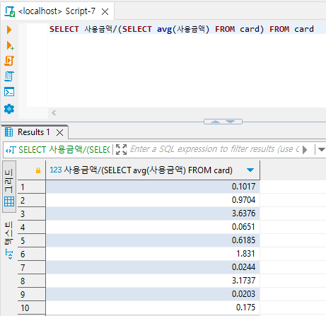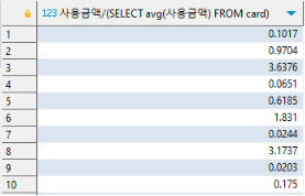 SELECT 사용금액/(SELECT AVG(사용금액) FROM card) FROM card