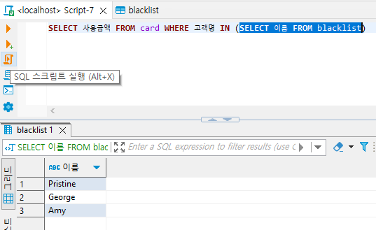 - 서브쿼리문만 따로 실행하고 싶을 때는 해당 문법을 드래그하고 실행버튼을 눌러보면 됩니다.