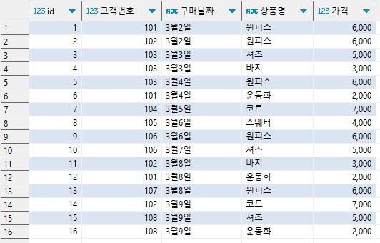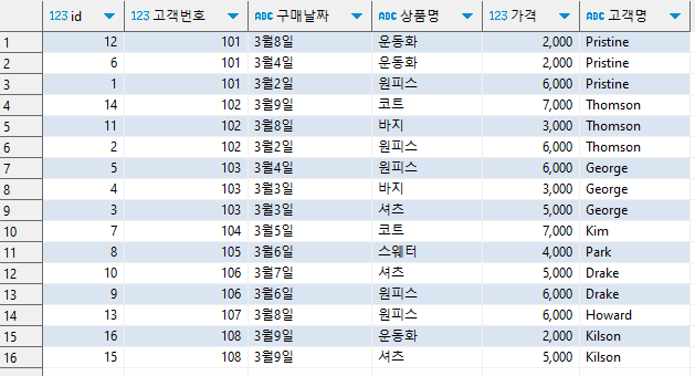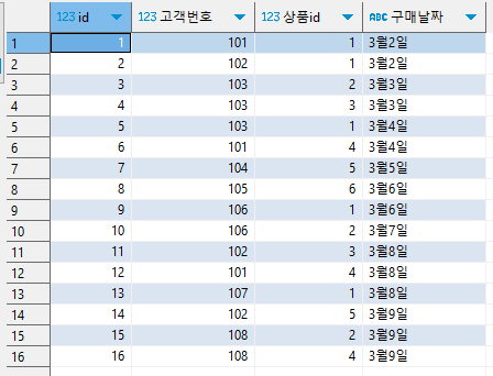 SELECT sales.id,고객번호,구매날짜,상품명,가격 FROM sales INNER JOIN product ON sales.상품id=product.id