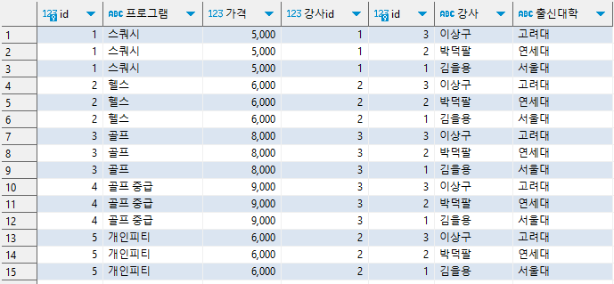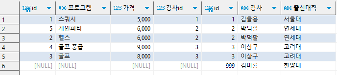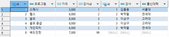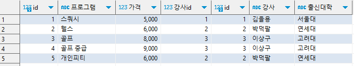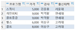 - 아래처럼 프로그램, 가격, 강사 출신대학 4개의 컬럼 한번에 출력하려면 어떻게 해야할까요?