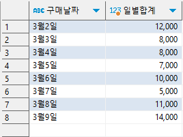 SELECT 구매날짜, SUM(가격) AS 일별합계 FROM sales INNER JOIN product ON sales.상품id=product.id GROUP BY 구매날짜
