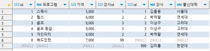 SELECT * FROM program LEFT JOIN teacher ON program.강사id = teacher.id UNION SELECT * FROM program RIGHT JOIN teacher ON program.강사id = teacher.id;