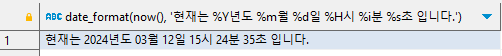 SELECT date_format(now(), '현재는 %Y년도 %m월 %d일 %H시 %i분 %s초 입니다.')