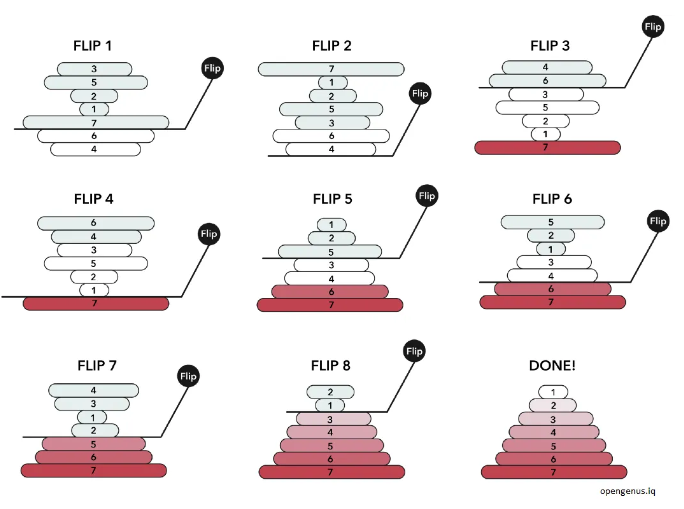 - 무작위로 쌓여있는 팬케이크 중에서 가장 큰 팬케이크 찾아 그 펜케이크 밑에 뒤집개를 두고 크게 한번 뒤집습니다. 그러면 제일 큰 팬케이크가 제일 위에 쌓이게 됩니다.