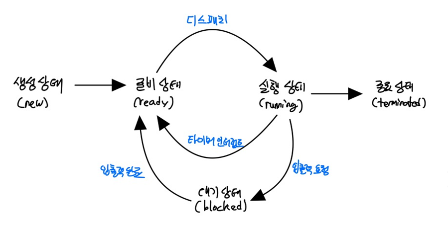 - 참고로 특정 이벤트가 일어나길 기다릴 때도 프로세스는 대기 상태가 됩니다. 다만 일반적으로 입출력 작업일 때 대기 상태가 되는 경우가 많기 때문에 프로세스가 입출력 작업을 하면 대기 상태가 된다고 생각해도 무방합니다.