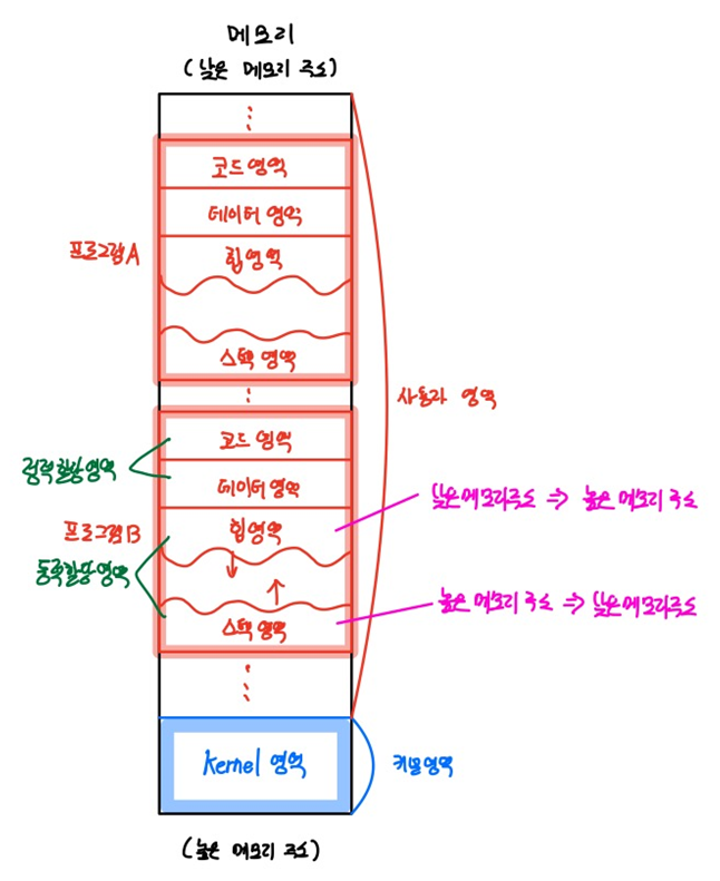 - 하나의 프로세스는 메모리의 사용자 영역에 크게 코드 영역, 데이터 영역, 힙 영역, 스택 영역으로 나뉘어 저장됩니다.