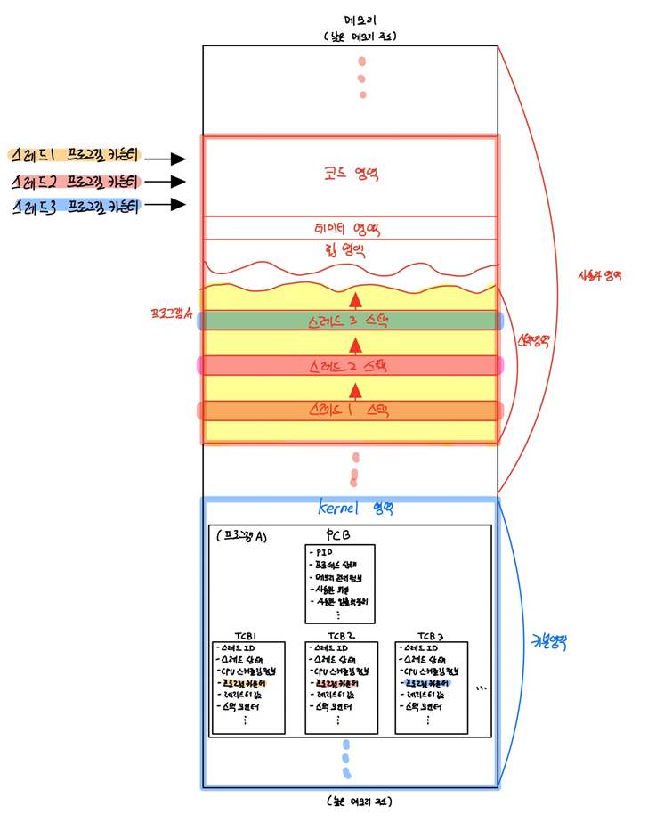 - 멀티 스레드 환경에서는 기존에 PCB에만 저장되는 정보와 다소 차이가 존재합니다. 스레드 별로 실행이 되기때문에 TCB(Thread Control Block)에 별도로 저장해주어야합니다.