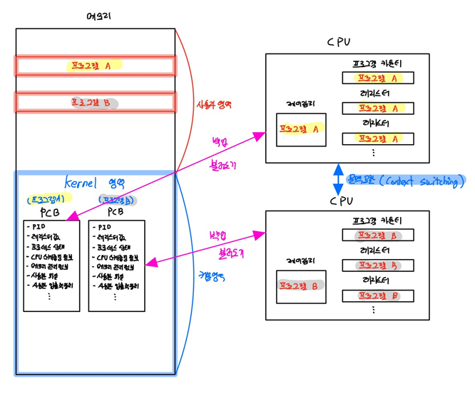 - 기존에 CPU가 프로그램 A를 실행하고 있을 경우에는 프로그램 A의 문맥을 PCB에 백업한 뒤, 프로그램 B의 문맥을 PCB에서 불러옵니다.