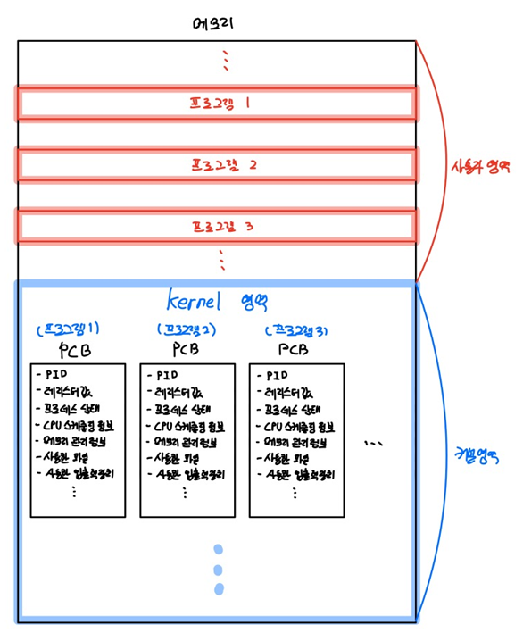 - PCB는 커널 영역에 생성됩니다. (운영체제가 프로세스를 식별하고 관리하기 위한 정보이기 때문에 커널 영역에 존재)