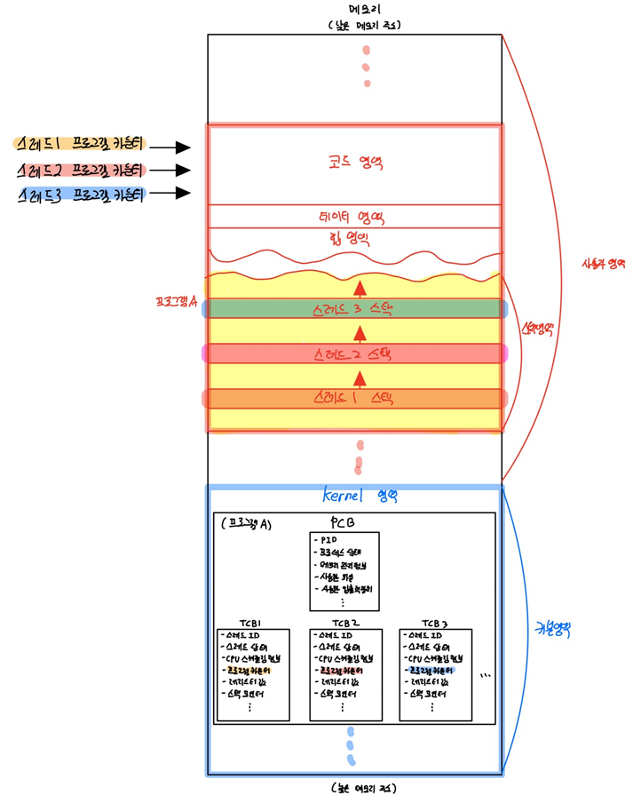 - 스레드의 경우, 각자 코드부분이 어디인지 알아야 하기 때문에 스레드별로 프로그램 카운터 값을 비롯한 레지스터 값들과 각자 자신만의 스택영역(ex. 지역변수)을 가집니다.
