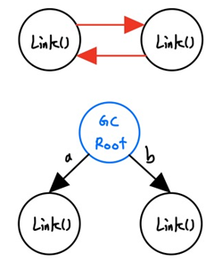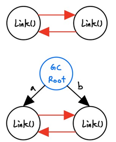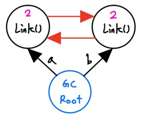 - a와 b가 다른 값을 지정하므로 기존 객체들에 대한 참조 카운트 값은 1 씩 줄어들 것입니다. 하지만 그 객체들은 서로를 가르키고 있어 참조 카운트가 여전히 1입니다. a와 b가 둘다 사라져 이 객체에는 더 이상 접근할 방법도 없어 참조 카운팅 방식을 통해 메모리에서 제거할 방법은 없습니다.