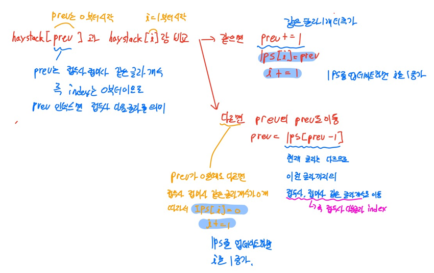 - 정리하면 현재까지 체크한 글자들이 타겟글자들과 같은데 만약 haystack의 다음 글자에서 타겟글자와 다르다고 한다면 현재까지 체크한 타겟글자들의 접두사의 다음 글자랑 haystack의 다음 글자와 비교하면 됩니다.(이렇게 하면 접미사체크했던 것을 접두사 체크했던 것으로 생각해서 시간을 단축할 수 있습니다.)
