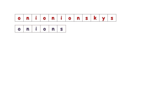 - 이경우 onion 단어의 마지막 n부분의 LPS를 보면 2입니다. (on가 접두사와 접미사) 따라서 타겟단어 onions 중에서 ions만 체크를 진행해 주면 됩니다.
