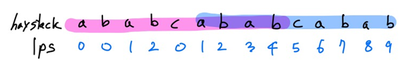 - (i=2, prev=0) hay[2]=a, hay[0] =a 같으므로, prev +=1 / LPS[2]=prev / i+=1 (LPS가 업데이트되면 항상 i도 같이 업데이트)