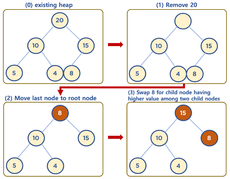 - 가장 최상단 노드를 제거한 뒤에 최하단층의 제일 오른쪽에 있는 노드를 최상단 노드로 옮겨줍니다. 그 후에 이제 자식노드들 중 더 큰 값과 swap을 진행하며 더 큰 값을 위로 올려주는 작업을 진행합니다. 값을 삭제할 때는 최상위 값을 삭제하고 다음으로 큰 값을 가져오는 과정을 진행합니다.. (힙은 각 노드가 자식노드값보다 작은 값을 갖지 않으면서 완전 이진 트리여야 합니다.)