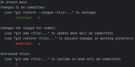 - b파일은 수정되고 stage에 올라간 상태이지만, stage에 올라간 이후에 추가로 수정된 상태입니다.(이 뒤에 작업은 아직 stage에 올라가지 않은 상태입니다.)