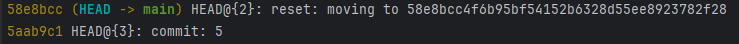 - 이 상태에서 무엇인가 잘못된 것을 알고 다시 5로 돌아가고 싶습니다. 이럴 경우 git reflog를 통해 HEAD가 위치했던 commit 내역들을 확인해서 5번 커밋 해시값을 찾고 해당 해시값으로 git reset --hard를 진행하게 되면, reset 하기 이전 상태로 다시 돌아가게 됩니다.