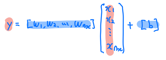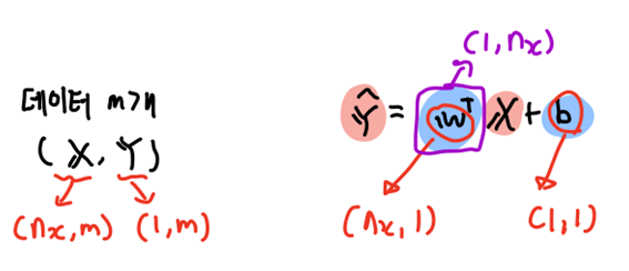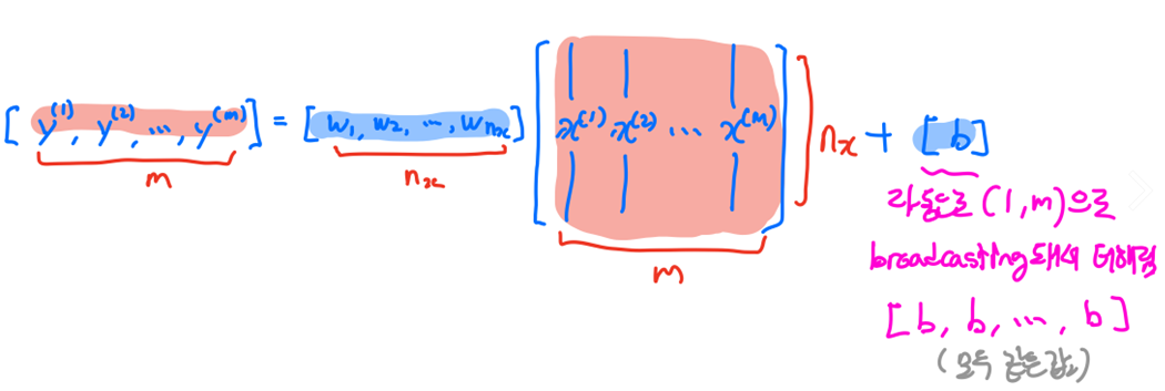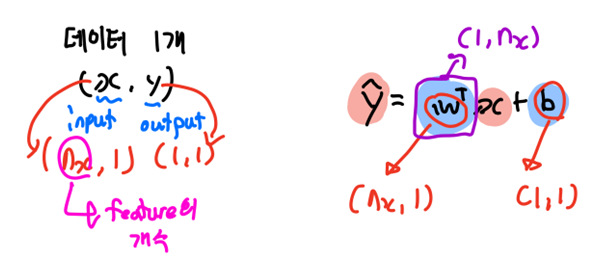 - 두 경우를 비교해 보면 w와 b 매개변수(파란색)는 그대로고, x와 y의 차원(빨간색)만 증가한 것을 확인할 수 있습니다.
