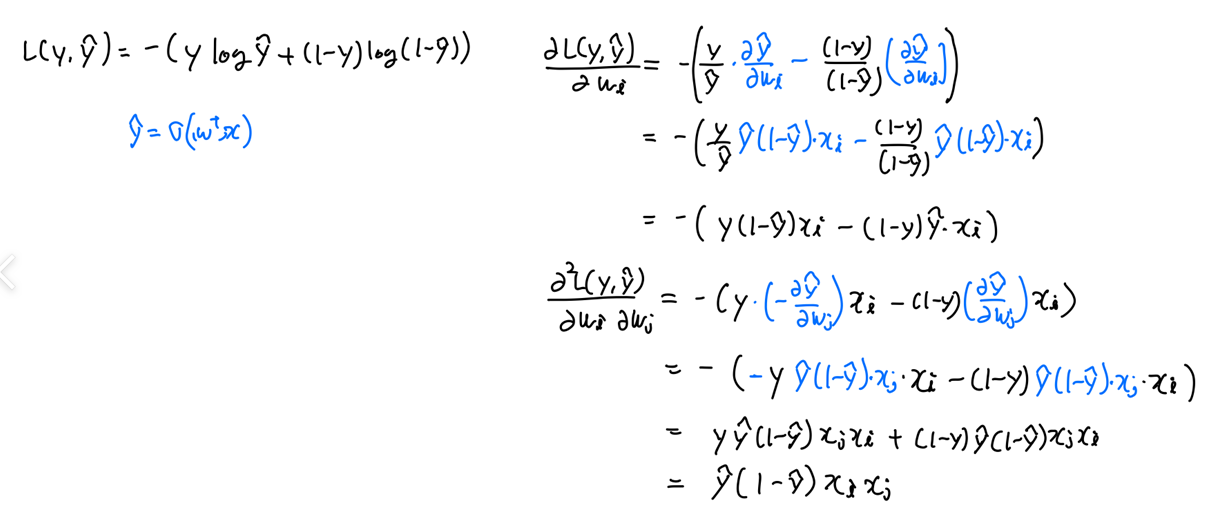 - 이제 이 식을 두 번 미분하여 이 식자체가 Convex 한지 확인해 보도록 하겠습니다. 이는 위에서 계산한 과정과 동일합니다. 하지만 위 식에서는 -가 없는데 -를 안 붙이고 계산하게 된다면 항상 양수가 아니고 항상 음수인 결과가 나오게 됩니다. 따라서 위 식에 -를 추가해 주어야 모든 매개변수에 Convex 한 loss 식을 가지게 됩니다.