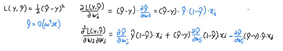 - 실제로 편미분을 진행해보면 시그모이드 함수가 추가되어서 똑같은 MSE loss지만 Hessian 행렬이 굉장히 복잡해지는 것을 확인할 수 있습니다. 실제로 계산해 보면 Hessian 행렬이 positive semi-definite 하지 않다는 것을 알 수 있습니다.)