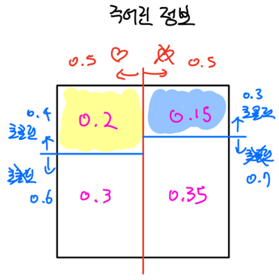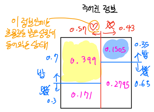 - 이제 여기서 주목해야 할 것은 초콜릿을 줬을 때 좋아할 확률이기 때문에 노란색 영역과 파란색 영역을 살펴봐야 합니다. 그 영역에 대한 조건부확률 P(좋아함|초콜릿)을 구하면 다음과 같습니다.