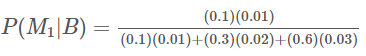 - 한 공장에서 어떤 제품을 생산할 때 M1, M2, M3 기계를 사용합니다. 각 기계는 전체 생산량의 10%, 30%, 60%를 차지하고 있습니다. 모든 기계는 불량이 발생할 수 있는데, 각 기계의 불량률은 1%, 2%, 3%입니다.(각 기계를 사용했을 때, 불량률) 불량품이 발생했을 때, 기계 M1에서 발생했을 확률을 구하시오. (즉, P(M1|불량품발생)을 구하시오.)