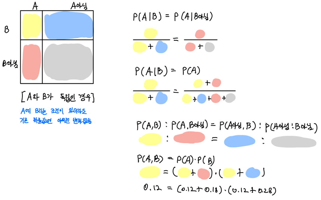 - 확률에서 독립은 사건 A와 사건 B 사이에 전혀 상관관계가 없다는 뜻입니다. (즉, 독립이 아닐 경우 사건 A에 사건 B와 연관된 조건이 있다면, 확률값이 변화한다는 것입니다. 반대로 독립이라면 사건 A에 어떠한 사건 B와 연관된 조건이 추가되더라도 확률값은 그대로 유지가 됩니다. 아래 그림을 참고하면 조금 더 이해하기 쉬울 것입니다.)