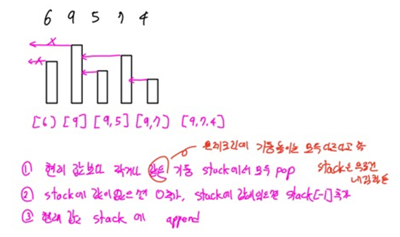 - 그 후, stack에 만약 값이 없다면 현재 기둥이 가장 높은 것이므로 0을 추가해주고, 만약 값이 있다면 해당 기둥으로 쏘는 것이기때문에 해당 기둥의 인덱스를 추가해줍니다.