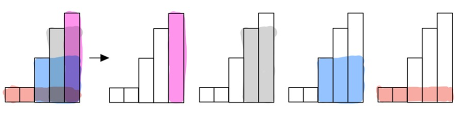 - 뒤에 것이 더 작다면 이제는 계단식이 되지 않기 때문에, 해당 넓이는 미리 계산을 해두는 것입니다. 뒤에것들보다 큰것들을 또 따로 보게 되면, 이것들 역시 계단식으로 형성되어져 있을 것입니다. 이것들에 대해서도 계단식으로 넓이를 구해주면 됩니다.
