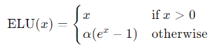 - ELU(Exponential Linear Unit) 함수는 양수 입력에 대해서는 그대로 값을 출력하고, 음수 입력에 대해서는 지수적 감소를 통해 출력값을 제공합니다.