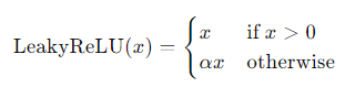 - ReLU의 변형으로, 음수 입력에 대해 아주 작은 기울기를 부여하여 'Dying ReLU' 문제를 어느 정도 해결합니다.