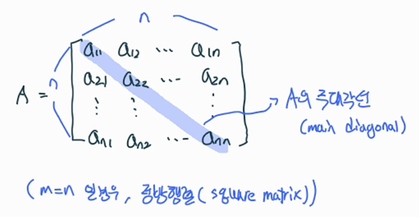 - 행렬에서 m과 n이 같은 경우 정방행렬(square matrix)라고 합니다. 정방행렬의 대각선의 값은 행렬의 주대각선(main diagonal)이라고 합니다.