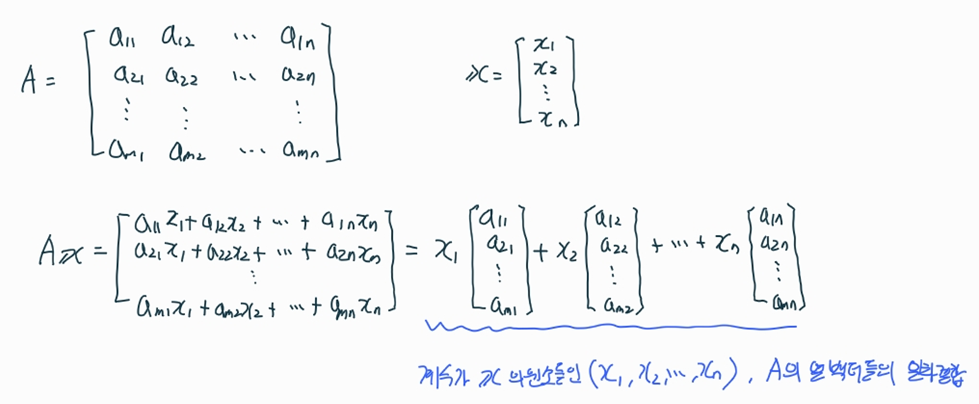 - 이것을 생각해서 Ax를 일차결합으로 표현해보겠습니다. 계수가 x벡터의 원소들인, A의 열벡터들의 일차결합이 됩니다.