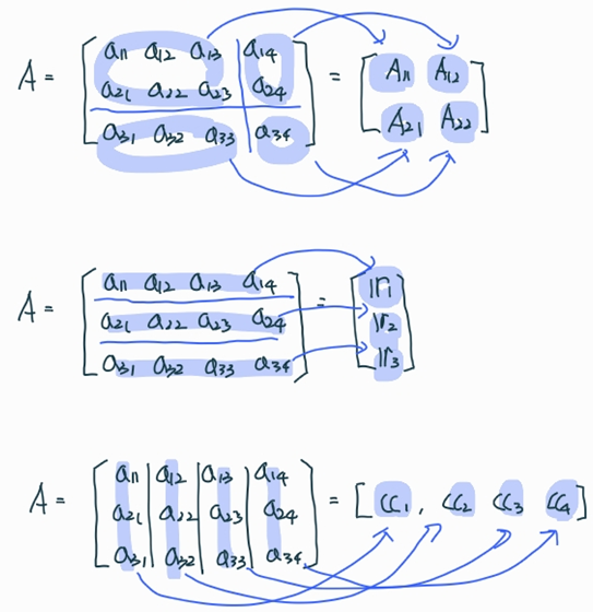 - 행렬은 선택된 행과 열 사이에 수평선과 수직선을 넣어서 더 작은 행렬로 분할될 수 있습니다.