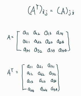 - A가 m x n 행렬이면 A의 전치행렬(A^(T))은 n x m 행렬이고 A의 행과 열을 바꾼 행렬입니다.