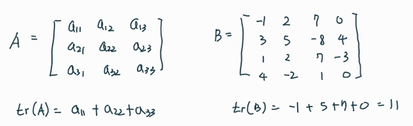 - A가 정방행렬이라면 A의 대각합(trace)은 tr(A)로 표기되고 A의 주 대각선 상에 있는 원소들의 합으로 정의가 됩니다. 만약 A가 정방행렬이 아니면 A의 대각합은 정의되지 않습니다.