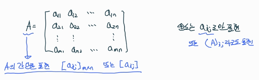 - 행렬은 숫자들의 직사각형 배열입니다. 배열 안에 있는 숫자들은 행렬의 원소라고 합니다.