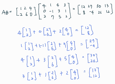- 만약 AB 연산결과에서 2번째 열만 필요하다면 AB를 전체를 계산할 필요 없이 B의 2열만을 이용하여 계산할 수 있습니다. 마찬가지로 1번째 행만 필요하다면 AB를 전체를 계산하지말고 A의 1행만을 이용하여 계산할 수 있습니다.