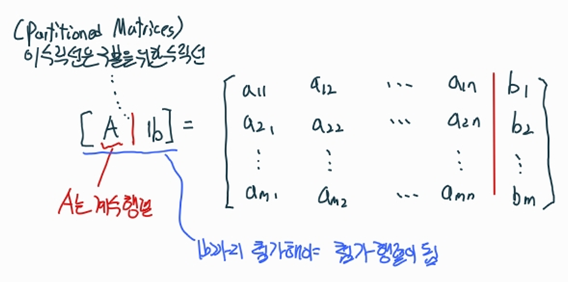- 여기서 A는 계수행렬(coefficient matrix)이고 첨가행렬까지 되려면 b 벡터까지 첨가되어야지 첨가행렬(augmented matrix)이 됩니다.